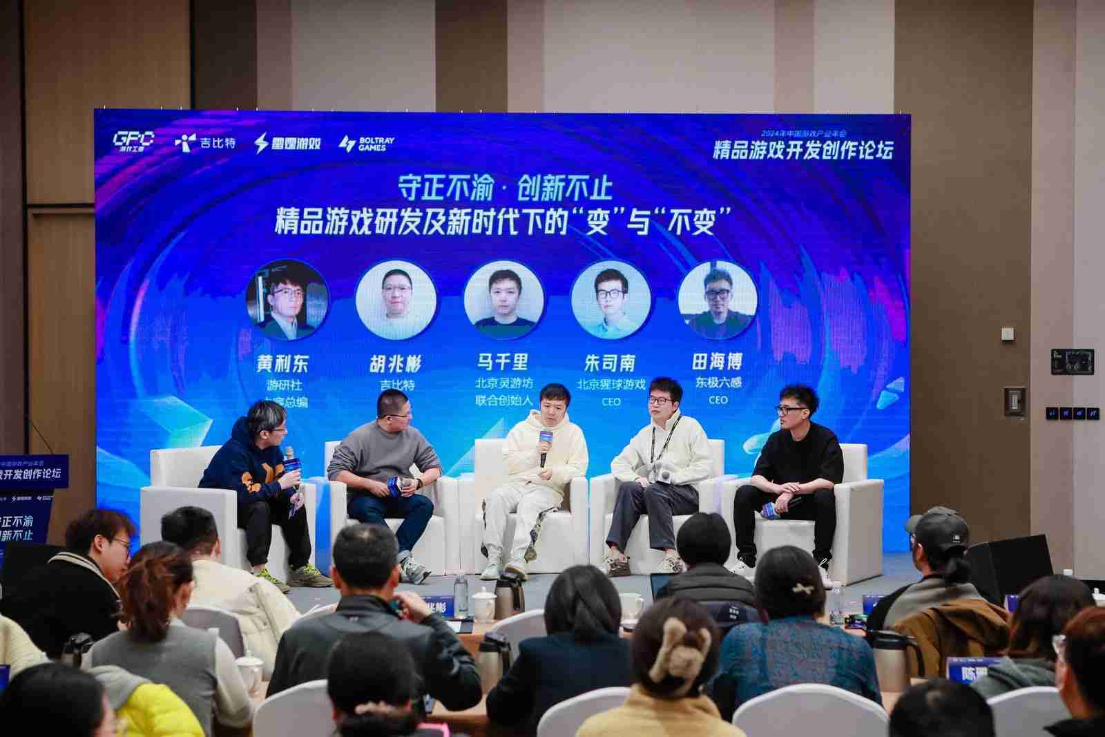 圓桌對話環節,,,,在游研社內容總編黃利東的主持下,,35273CTO胡兆彬、、、、北京靈游坊聯合創始人馬千里、、、、北京猩球游戲CEO朱司南、、東極六感CEO田海博等四位嘉賓圍繞“守正不渝、、創新不止——精品游戲研發及新時代下的‘變’與‘不變’”這一主題分享了各自在精品游戲開發理念及工程能力搭建方面的見解和經歷,,并就行業變化下游戲人需要堅守的理念等展開交流探討。。。