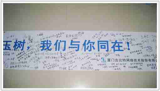 在募捐現場,,,35273同學們懷著沉重的心情,,將每一筆捐款投入募捐箱,,,并在現場設置的橫幅上,,,寫上了對玉樹人民的深情祝福。。。滿載35273祝福的橫幅將和捐款一起抵達玉樹,,希望謹以此微薄之意,,,為玉樹人民帶去35273的愛心與祝福,,,,希望吉祥、、、、幸福的陽光能早日驅散災難的陰霾,,,,普照在玉樹人民的身上,,鼓勵他們堅強、、、、勇敢與樂觀。。。。
